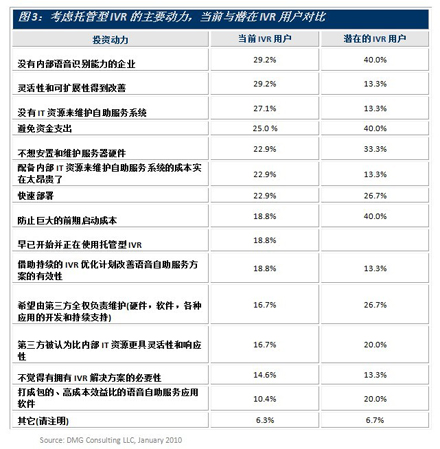 圖3顯示了現有和潛在的語音自助服務用戶尋求托管型IVR的主要動力來源。潛在客戶認真考慮托管型IVR解決方案的兩個很明顯的原因是避免大的資金開銷和最小化啟動成本,在經濟不景氣時這樣的做法并不令人意外。另外還有個原因是希望一邊使用該方案一邊積累經驗和知識。