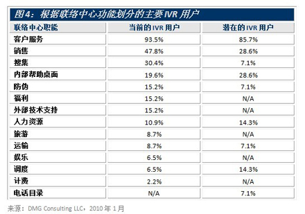 圖4根據職能對現有和潛在的主要IVR用戶進行了區(qū)分?蛻舴⻊蘸弯N售聯絡中心是最上層的IVR用戶,分別占現有用戶量的93.5%和47.8%,占潛在用戶量的85.7%和28.6%。