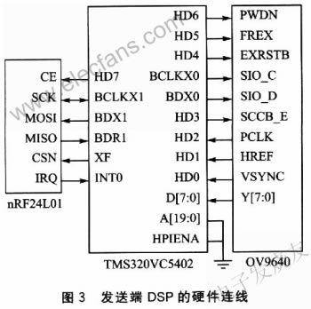該芯片使用OmniVision公司自主開發(fā)的SCCB總線進(jìn)行控制,使用三線連接。其中SCCB_E為串口允許/禁止信號(hào)線,SIO_C和SIO_D分別為串口時(shí)鐘線和數(shù)據(jù)線。系統(tǒng)中僅對(duì)OV9640進(jìn)行控制而不需要獲知其狀態(tài),采用DSP的McBSPO端口進(jìn)行連接,其中HD3用于打開串口,BCLKX0和HDX0分別用于發(fā)送時(shí)鐘信號(hào)和控制數(shù)據(jù)。具體的硬件連線如圖3所示。
