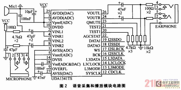 語音采集和播放模塊的作用是將音頻模擬信號(hào)轉(zhuǎn)換為數(shù)字信號(hào),并對(duì)信號(hào)進(jìn)行PCM編碼。其電路如圖2所示。采用Philips公司的UDA1341 TS型立體聲音頻CODEC進(jìn)行音頻編解碼。該芯片提供2個(gè)麥克風(fēng)輸入,可實(shí)現(xiàn)單端輸入、差分輸入等靈活配置,并設(shè)置了可編程增益放大器和自動(dòng)增益控制器,可保證高質(zhì)量的音頻獲;同時(shí),還集成了聽筒和喇叭輸出的驅(qū)動(dòng)器,喇叭音量可以通過編程調(diào)整。S3C2440A-40微處理器與UDA1341TS編解碼器通過I2S總線直接相連,并采用DMA發(fā)送/接收方式,完成系統(tǒng)的錄音和放音。