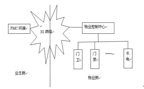 如何實現(xiàn)由業(yè)主決定是否讓來訪者進入小區(qū)呢?利用FMC技術(shù)實現(xiàn)小區(qū)的物業(yè)管理(為了敘述方面,簡稱為FMC小區(qū)),就能容易解決。下圖為FMC小區(qū)的拓撲結(jié)構(gòu)圖。