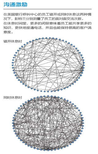 去年,彭特蘭的實驗室與美國銀行(Bank of America)設(shè)在羅得島(Rhode Island)的呼叫中心合作,在80 名中心員工身上安裝了社會傳感器。這種傳感器看起來像一枚不顯眼的徽章,使用藍牙和紅外信號監(jiān)測實驗對象每分鐘與哪些同事交談。測試活動先開展了一個月,后來又進行了6周。第一個月后,實驗室的研究人員發(fā)現(xiàn),與更多同事進行過交談的員工能夠更快地接通電話,他們自我感覺的壓力也相對較小,而客戶滿意度卻與其他人一樣高。與刻板地遵循員工手冊或服從經(jīng)理的電子郵件指示相比,通過非正式的閑聊來交流問題和解決方案似乎能取得更好的結(jié)果。有了這種結(jié)論之后,該呼叫中心嘗試盡量將員工的休息時間安排在一起,而非像過去那樣錯開。這樣員工就有了更多的時間參與閑聊。幾個月后,美國銀行向?qū)嶒炇覉蟾媪私Y(jié)果:該呼叫中心獲得了相當(dāng)于每年1,500 萬美元的生產(chǎn)力提升。