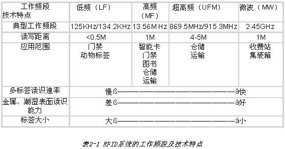 RFID系統(tǒng)的工作頻段可以為低頻(LF)(30-300kHz,典型頻率有125 kHz,134.2 kHz)、高頻(HF)(3-30MHz,典型頻率為13.56M Hz)、超高頻(UHF)(300-968MHz,典型頻率869.6MHz、915.3MHz)、微波(MW)(2.45-5.8GHz,典型頻率為2.45GHz)等四個頻段,具體的頻點由各個國家或地區(qū)的無線電管理部門確定。根據(jù)不同的工作頻段,在無源的情況下,其技術(shù)特點和應(yīng)用范圍也不同,如下表所示:
