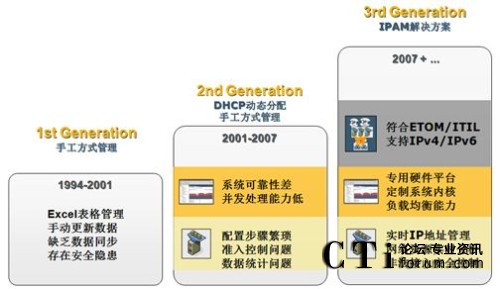 新一代網(wǎng)絡(luò)核心服務(wù)自動(dòng)化管理支撐平臺(tái)能自動(dòng)、有效地管理訪問(wèn)網(wǎng)絡(luò)的IP/MAC 資源,實(shí)時(shí)提供更新數(shù)據(jù),控制未授權(quán)IP/MAC地址訪問(wèn)網(wǎng)絡(luò),從而提高內(nèi)部網(wǎng)絡(luò)的可管理性和安全性。下圖是網(wǎng)絡(luò)核心服務(wù)解決方案的所經(jīng)歷的發(fā)展階段: