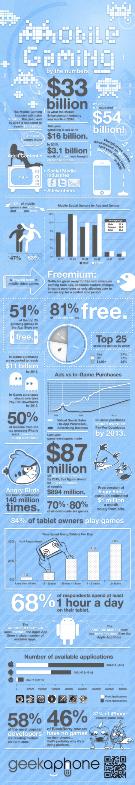 隨著移動(dòng)互聯(lián)網(wǎng)浪潮的興起,大家玩游戲的平臺(tái)逐漸從傳統(tǒng)的游戲機(jī),PC,TV向新興的智能手機(jī)和平板電腦等移動(dòng)終端遷移。PC時(shí)代的游戲巨頭EA,育碧等公司的光芒不再,PopCap,Rovio和Zynga等新興游戲公司出品的游戲則吸引著越來(lái)越多的玩家。照目前強(qiáng)勁的發(fā)展趨勢(shì)來(lái)看,移動(dòng)游戲在未來(lái)將取得像PC游戲現(xiàn)在的地位,成為游戲市場(chǎng)的主力。關(guān)注移動(dòng)終端發(fā)展的博客Geekaphone制作了下面這張超大信息圖,用詳細(xì)的統(tǒng)計(jì)數(shù)字展示了移動(dòng)游戲發(fā)展的強(qiáng)勁趨勢(shì)。