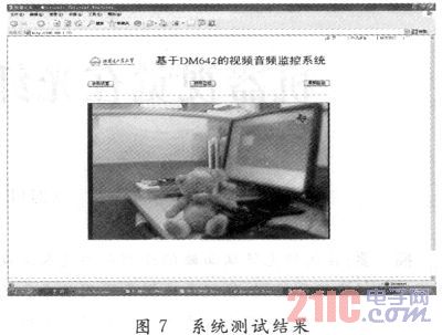 在集成開發(fā)環(huán)境CCS(C6000)下,加載相關(guān)驅(qū)動程序,對本系統(tǒng)進(jìn)行了測試。CCD攝像頭為標(biāo)準(zhǔn)PAL制式,圖像采集的幀頻為25幀/s,圖像的分辨率為720×576像素。測試結(jié)果如圖7所示。測試結(jié)果表明,網(wǎng)絡(luò)連接正常,用戶在PC端可通過瀏覽器訪問系統(tǒng),成功實(shí)現(xiàn)遠(yuǎn)程監(jiān)控。