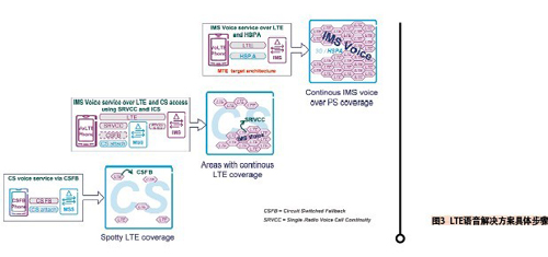 讓我們來(lái)看看主流運(yùn)營(yíng)商在LTE時(shí)代有哪些語(yǔ)音解決方案可以挑選,以及它們的優(yōu)劣比較(見表1)。圖3為實(shí)現(xiàn)LTE語(yǔ)音解決方案的具體步驟。