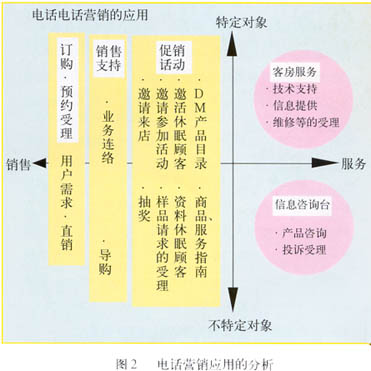 ——圖2表示以電話營銷的目的及對象為軸分析電話營銷的應用。縱軸為對象,分為“特定”和“不特定”,橫軸為目的,分為“服務”和“銷售”。這樣右上區(qū)域=“特定對象X服務”,即為客戶服務,右下區(qū)域=“不特定對象X服務”,對應信息咨詢;左側(cè)為銷售。從對象來看,服務更偏重于“特定對象”。從目的來看,訂購/預約受理是最直接的銷售行為,所以放在最左,銷售支持在中間,促銷活動靠右。