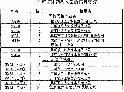 信產(chǎn)部公告稱,對這次經(jīng)營許可證注銷涉及的13個號碼,將依據(jù)《電信網(wǎng)碼號資源管理辦法》(信息產(chǎn)業(yè)部令第28號)將予以收回。(高飛)