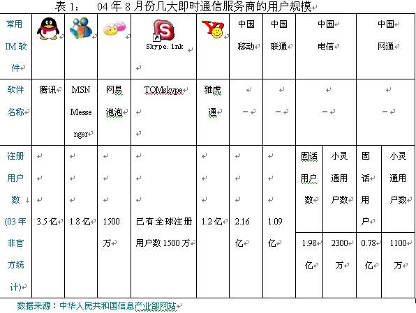 目前國內(nèi)面向個人的即時通信產(chǎn)品主要有騰訊QQ,微軟MSN,網(wǎng)易泡泡,ICQ,雅虎通以及現(xiàn)在發(fā)展勢頭正猛的TOM-skype等;面向企業(yè)用戶的即時通信產(chǎn)品比較多,但是除了騰訊,微軟等少數(shù)運營商用戶比較多以外,其他的推出時間都很短,用戶極少,市場有待進一步開發(fā)。