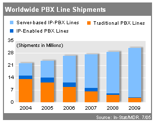據(jù)In-Stat報(bào)告說,隨著IP線路出貨量今年有望超過傳統(tǒng)PBX,IP PBX進(jìn)入了一個(gè)新的成熟階段。雖然整個(gè)PBX市場(chǎng)預(yù)計(jì)將以6.6%的復(fù)合年增長(zhǎng)率增長(zhǎng)至2009年,但傳統(tǒng)PBX正在迅速下滑,IP PBX勢(shì)頭越來越強(qiáng)。