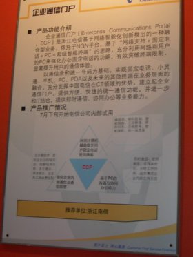 近日,中國(guó)電信在西安召開(kāi)了上半年市場(chǎng)工作會(huì)議暨新產(chǎn)品展示專題研討會(huì),在此次會(huì)議上,各省電信公司分別展示了自己面向市場(chǎng)開(kāi)發(fā)的新型業(yè)務(wù)。其中,來(lái)自浙江電信的一種叫企業(yè)通信門(mén)戶ECP(Enterprise Communications Portal)的主推業(yè)務(wù)在展示過(guò)程中吸引了眾多目光,引起了其他與會(huì)代表的關(guān)注,被認(rèn)為是中國(guó)電信拓展企業(yè)市場(chǎng)空間的最具潛力產(chǎn)品之一。