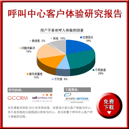 隨著呼叫中心服務(wù)在中國(guó)市場(chǎng)的蓬勃發(fā)展,每個(gè)人也都直接或間接的以某種形式成為呼叫中心的使用者,而這些呼叫中心服務(wù)提供商所提供的服務(wù)體驗(yàn)對(duì)其品牌的塑造至關(guān)重要。為更好了解呼叫中心用戶(hù)的客戶(hù)體驗(yàn),從而有助于改善并優(yōu)化用戶(hù)的呼叫中心體驗(yàn),我們組織了“呼叫中心客戶(hù)體驗(yàn)調(diào)查——中國(guó)大陸”,本次調(diào)查由澳大利亞的callcentres.net 和GCCRM共同組織,旨在以自然時(shí)間為序,從體驗(yàn)為中心的角度展現(xiàn)呼叫中心的客戶(hù)體驗(yàn),而非傳統(tǒng)的以流程或效率為中心。