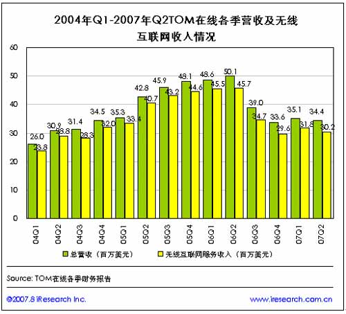 在2006年第二季度總營(yíng)收以及無(wú)線互聯(lián)網(wǎng)服務(wù)收入分別達(dá)到歷史最高點(diǎn)(分別達(dá)到5010萬(wàn)美元和4571萬(wàn)美元)之后,TOM在線各季收入及無(wú)線互聯(lián)網(wǎng)收入呈逐季下滑趨勢(shì),至2007年第二季度,TOM在線的總營(yíng)收為3439萬(wàn)美元,來(lái)自無(wú)線互聯(lián)網(wǎng)服務(wù)的收入為3024萬(wàn)美元!