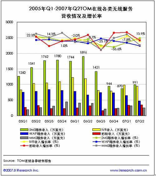 艾瑞市場(chǎng)咨詢整理從2005年第一季度至2007年第二季度以來(lái)TOM在線各無(wú)線服務(wù)類(lèi)別的營(yíng)收情況顯示,2005年第一季度至2006年上半年,TOM在線各無(wú)線服務(wù)類(lèi)別的營(yíng)收基本上處于上升階段,尤其以短信服務(wù)和IVR(語(yǔ)音互動(dòng)增值服務(wù))為主要增值點(diǎn)。