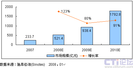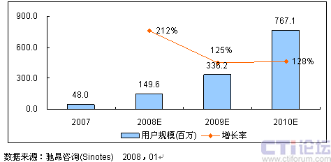 馳昂咨詢(Sinotes)發(fā)布的《2007-2008年中國3G后視頻應(yīng)用市場研究報告》顯示,2007年,中國視頻應(yīng)用市場規(guī)模為233.7億元,比2006年同期增長了84%,用戶規(guī)模近4800萬,比2006年的2300萬翻了一番。馳昂咨詢的分析師孟慶雯認(rèn)為,這主要得益于產(chǎn)業(yè)鏈各方在利用現(xiàn)有2.5G/2.75G網(wǎng)絡(luò)開展視頻應(yīng)用服務(wù)上做的有益嘗試。產(chǎn)業(yè)鏈各方的努力加快了3G視頻應(yīng)用市場培育步伐,基本滿足了在現(xiàn)有網(wǎng)絡(luò)條件下用戶對視頻服務(wù)的需求,確保了由2.5G/2.75G向3G的業(yè)務(wù)銜接和過渡。