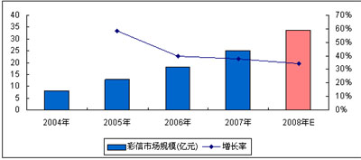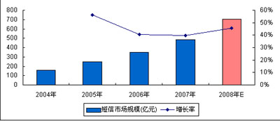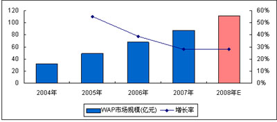 中國移動通信增值業(yè)務市場經(jīng)歷了一個曲折的發(fā)展歷程后開始日趨理性,2007年以來,移動通信增值業(yè)務的發(fā)展由爆發(fā)式增長進入平穩(wěn)快速發(fā)展階段。據(jù)統(tǒng)計,2008年上半年,中國移動增值服務市場規(guī)模達672.76億元,同比增長30%。其中短信市場規(guī)模以65.34%的比例位居第一,彩鈴和WAP分別以18.07%和8.61%的份額居其次。