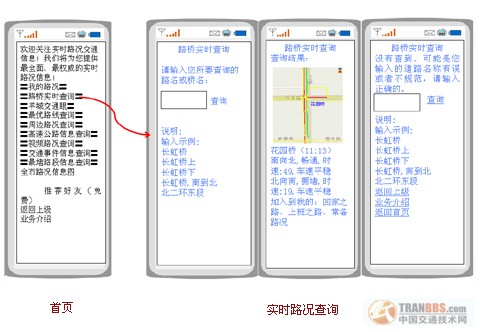 手機(jī)上通過(guò)短信查詢動(dòng)態(tài)交通信息,提供動(dòng)態(tài)路徑規(guī)劃,定制道路路況播報(bào)。