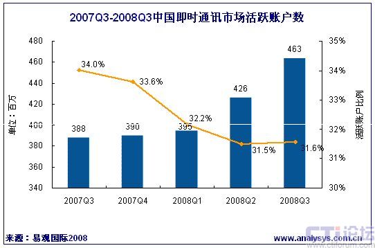 易觀國際(Analysys International)近期發(fā)布《2008年第3季度中國即時通信市場季度監(jiān)測》數據顯示,2008年第3季度中國即時通訊市場活躍賬戶數環(huán)比增長9%,達到4.63億,比去年同期增長19%,繼續(xù)保持穩(wěn)定的增長勢頭。