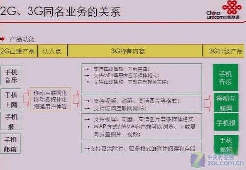 前不久,有論壇網(wǎng)友曝光了幾張聯(lián)通內(nèi)部3G培訓(xùn)所用的PPT截圖,其中不僅提到了聯(lián)通3G業(yè)務(wù)的運(yùn)營方式,2G/3G同名業(yè)務(wù)的關(guān)系,還再一次強(qiáng)調(diào)了聯(lián)通將重點(diǎn)推廣的3類九項(xiàng)主要3G業(yè)務(wù)。這和筆者前段時間為大家曝光的《官方Flash動畫:解析聯(lián)通3G九大特色業(yè)務(wù)》所提到的聯(lián)通9大特色3G業(yè)務(wù)保持一致。