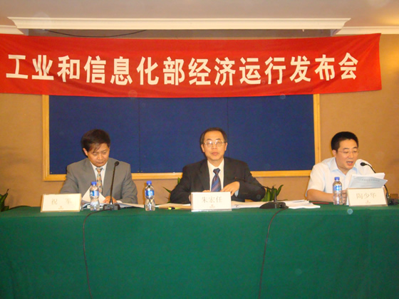 工業(yè)和信息化部總工程師、新聞發(fā)言人朱宏任(中)