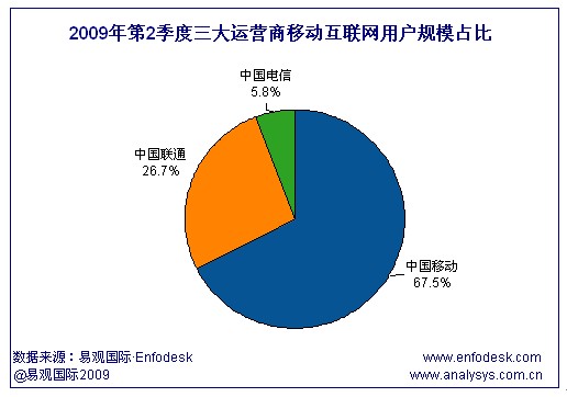 從中國三大運營商移動互聯(lián)網(wǎng)用戶規(guī)模的格局來看,中國移動2009年第2季度移動互聯(lián)網(wǎng)活躍用戶達10247萬人,占整體用戶市場規(guī)模的67.5%。而中國聯(lián)通GSM網(wǎng)絡的季度活躍用戶達4053萬人,中國電信CDMA網(wǎng)絡的季度活躍用戶為882萬人,分別占整體市場規(guī)模的26.7%和5.8%。