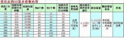 據(jù)了解,正式商用資費包含9個等級,從98元-886元不等,取消了試商用期間最高的1686元套餐,新增了98元、126元和156元三項套餐,超出套餐的語音資費也由原來的0.36元-0.24元/分鐘不等,調(diào)整為統(tǒng)一的0.12元/分鐘,比之試商用期間的半價資費還要低。