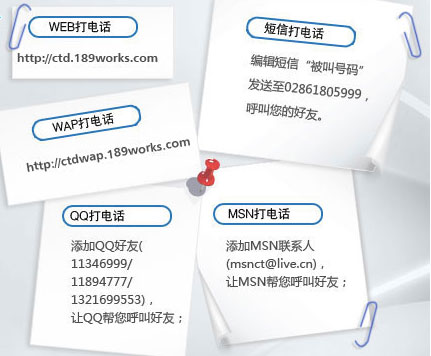據(jù)“通話寶”官方網(wǎng)站(http://ctd.189works.com/)介紹,“通話寶”目前支持WEB、WAP、短信及QQ和MSN五種撥打網(wǎng)絡(luò)電話的方式。用戶除了使用WEB、WAP訪問網(wǎng)頁撥打電話外,還可以通過添加特定的QQ號碼或者MSN聯(lián)系人實現(xiàn)帳號注冊、撥打電話等操作。