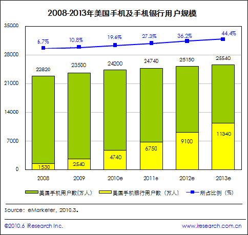 艾瑞咨詢根據eMarketer的統(tǒng)計數據發(fā)現,2010年美國手機銀行用戶占其手機用戶的比例將達到19.6%,到2013年將增長至44.4%。