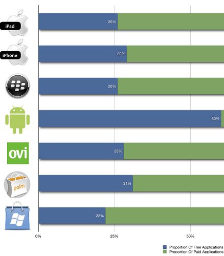 Windows市場(chǎng)中的免費(fèi)應(yīng)用程序比例最少,僅占其應(yīng)用程序總量的22%;其次為蘋果iPad應(yīng)用程序商店,其免費(fèi)應(yīng)用程序比例為26%。iPhone應(yīng)用程序商店中,免費(fèi)應(yīng)用程序的比例為29%。在付費(fèi)應(yīng)用程序方面,Android市場(chǎng)及Palm公司應(yīng)用程序商店中前100名熱銷應(yīng)用程序價(jià)格平均值高于所有收費(fèi)應(yīng)用程序價(jià)格均值。