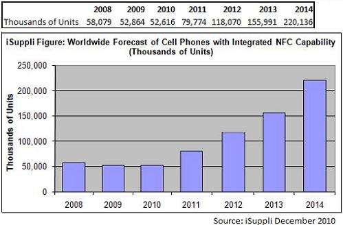 據市調機構iSuppli預估,到2014年,全球內建NFC的手機出貨量可望達到2.201億部,2010年該數(shù)字為5,260萬部。到了2014年,約有13%的手機內建NFC功能,而2010年該數(shù)字為4.1%。