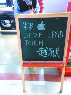 在北京某家樂福商場(chǎng)外的數(shù)碼店,給iPhone“越獄”的廣告牌格外醒目。