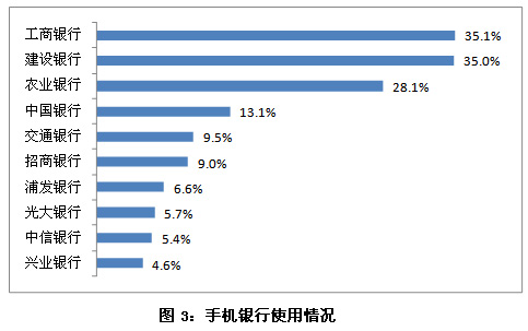 在對(duì)手機(jī)銀行用戶對(duì)手機(jī)銀行使用的情況分析來看,工商銀行(601398,股吧)手機(jī)銀行的使用率依然最高,達(dá)35.1%,建設(shè)銀行(601939,股吧)緊隨其后,為35.0%。通過進(jìn)一步的分析發(fā)現(xiàn),在經(jīng)常使用手機(jī)銀行的用戶中,對(duì)建設(shè)銀行手機(jī)銀行的使用率(37.4%)略高于對(duì)工商銀行的使用率(36.0%),這表明建設(shè)銀行的用戶相對(duì)養(yǎng)成了使用手機(jī)銀行的習(xí)慣。另外,農(nóng)業(yè)銀行(601288,股吧與中國銀行的使用率在這半年中都有顯著提升,不斷縮小與行業(yè)領(lǐng)跑者的差距。