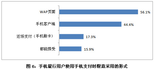 另外,手機(jī)銀行用戶使用手機(jī)支付時(shí),首選的是WAP頁面,56.1%的用戶更愿意采用這種形式。其次是手機(jī)客戶端,其比例為44.4%。近場(chǎng)支付(手機(jī)刷卡)這樣支付形式較為新穎,愿意使用的用戶比例僅占17.3%。此外,有15.9%的人以上三種方式都能接受。