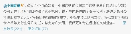 4月22日上午消息,中國聯(lián)通昨日在新浪微博上宣布,中國聯(lián)通正式組建了聯(lián)通沃易付網(wǎng)絡技術有限公司,并于4月18日領取了營業(yè)執(zhí)照,公司注冊資本2.5億。