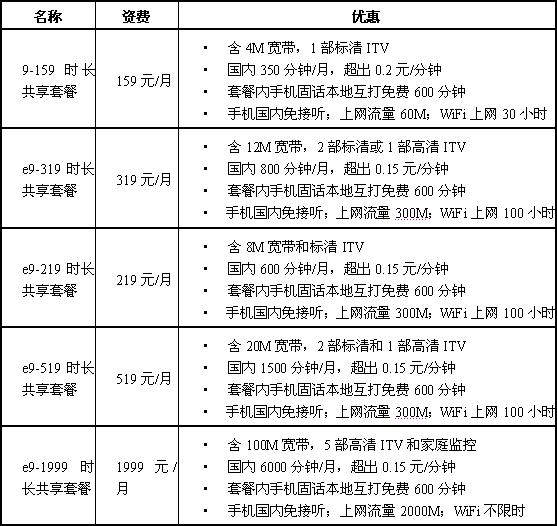 注:中國電信固定電話用戶(未安裝中國電信寬帶):在時尚包和全能包收費基礎上另增加10元/月使用費。