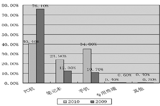 以手機(jī)為閱讀載體的比例從2009年的10.7%激增到2010年的34.8%。相比之下,PC機(jī)閱讀則出現(xiàn)了大幅度地滑落,從2009年的76.1%下降到2010年的40.4%?梢(jiàn),大部分通過(guò)PC機(jī)閱讀的讀者更加傾向或習(xí)慣于手機(jī)閱讀。