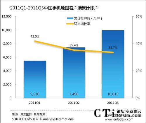 2011年第3季度中國(guó)手機(jī)地圖客戶端累計(jì)帳戶過(guò)億