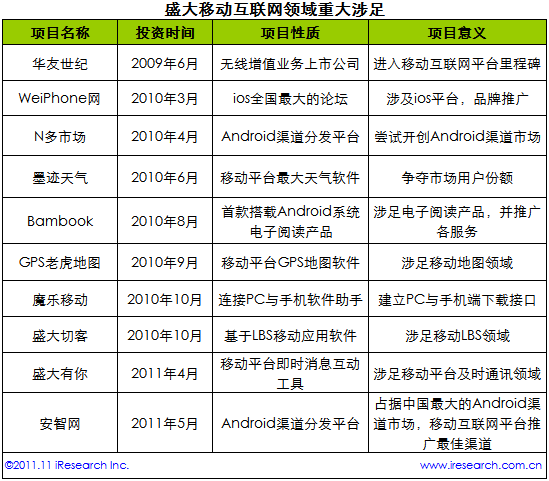 根據(jù)艾瑞咨詢整理的數(shù)據(jù)認(rèn)為,盛大一向秉持這“產(chǎn)業(yè)布局比產(chǎn)品開發(fā)更重要”的想法,縱觀盛大在幾年中對(duì)移動(dòng)互聯(lián)網(wǎng)的產(chǎn)業(yè)鏈建立,投資及開發(fā)項(xiàng)目可謂是星光奪目。