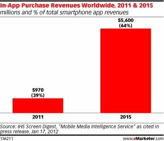 IHS Screen Digest預計,應用內(nèi)置支付將成為移動應用營收的新標準。游戲開發(fā)商共同通過向用戶提供免費應用下載服務(wù),然后向用戶進入新層次內(nèi)容收取費用已證明這種“免費增值”模式非常的成功。IHS Screen Digest預計,到2015年,應用內(nèi)置支付將占據(jù)智能手機應用營收總額的64%,遠超過2011年的39%。