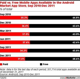 通過對2010年9月至2011年12月Android Market應用商店的分析,進一步表明了對免費應用模式的依賴性。根據(jù)第三方應用程序跟蹤服務(wù)AndroLib提供的數(shù)據(jù),2010年9月Android Market應用商店下載的大約65%應用均為免費應用;在2011年12月,這一比例已經(jīng)提升至69%。