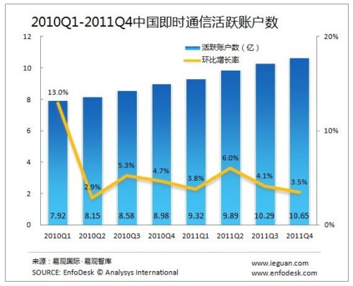 CTI論壇(ctiforum)3月23日消息(記者 潘婷婷): 根據(jù)EnfoDesk易觀智庫發(fā)布的《2011年第4季度中國即時通信市場季度監(jiān)測》數(shù)據(jù)顯示,截止到2011年底,中國即時通信活躍賬戶數(shù)達到10.65億,環(huán)比增長3.5%,同比增長18.62%。
