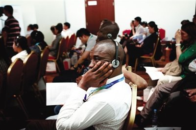 昨日,京交會上,“中國分銷服務業(yè)企業(yè)走出去”會場,一位外籍嘉賓在認真聽同聲傳譯。新京報記者 孫純霞 攝