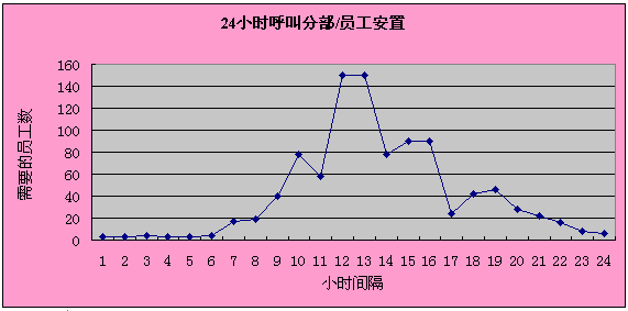 呼叫中心一年中要運行365天,也就是說每天需要三次8小時工作替換。一天中員工需求量會隨著呼叫量高峰期和低估期而波動。下面的圖標詳細說明了平時可能需要的變化的員工需求。