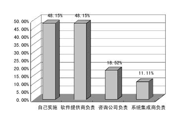 在用戶如何實施CRM系統(tǒng)的調(diào)查中,已應(yīng)用CRM的單位一般都是由自己或軟件提供商負責(zé),而沒用CRM的企業(yè)則大多期望能由軟件提供商負責(zé)。這說明,用戶實施CRM的主體意識還不夠強。
