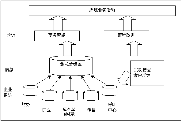 分析型CRM,也著稱為“后臺”或“戰(zhàn)術”CRM。用來分析理解發(fā)生在前臺的客戶活動。分析型CRM需要技術(編譯和處理大量的客戶數(shù)據(jù),以便于分析)和新的業(yè)務流程(提煉面向客戶的業(yè)務,以提高忠誠度和利潤率)。在分析師和業(yè)界專家的推動下,如今大多數(shù)CRM供應商,或者創(chuàng)造分析型CRM能力,或者與商務智能(BI)供應商合伙,合作分析他們的數(shù)據(jù)。圖2表明了數(shù)據(jù)和流程如何用來提煉業(yè)務活動。