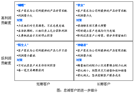 CRM廠商和業(yè)界普遍認(rèn)為:只要贏得了客戶的忠誠(chéng),企業(yè)將"財(cái)源滾滾";因此企業(yè)在培養(yǎng)客戶忠誠(chéng)方面的開(kāi)支在逐步上升。因?yàn)閺谋砻嫔峡磥?lái),客戶滿意度、客戶忠誠(chéng)度和客戶保留度越高,客戶利潤(rùn)貢獻(xiàn)度就大。但事實(shí)并不如他們所愿,《哈佛商業(yè)評(píng)論》最新的論文,研究表明:客戶滿意度、客戶忠誠(chéng)度與客戶利潤(rùn)貢獻(xiàn)度的關(guān)聯(lián)程度比預(yù)期的要小得多。企業(yè)應(yīng)當(dāng)對(duì)忠誠(chéng)客戶再進(jìn)行細(xì)分,然后在更細(xì)化的客戶基礎(chǔ)上對(duì)其進(jìn)行分類管理,并采取相應(yīng)的對(duì)策。在論文中,作者根據(jù)利潤(rùn)貢獻(xiàn)度大小與客戶的短長(zhǎng)期兩個(gè)維度,將忠誠(chéng)客戶進(jìn)行了深層次細(xì)分。主要分成四類:"蝴蝶"、"摯友"、"陌生人"、"神秘者"。企業(yè)應(yīng)該根據(jù)每一類的情況采取相應(yīng)的對(duì)策。管理那些能使企業(yè)盈利但不忠誠(chéng)的客戶--"蝴蝶"--的關(guān)鍵是,在他們購(gòu)物時(shí)盡可能地從他們身上獲利。對(duì)那些既能帶來(lái)利潤(rùn)又忠誠(chéng)的客戶--"摯友",細(xì)心呵護(hù)他們則更為恰當(dāng)。至于那些忠誠(chéng)但不能帶來(lái)利潤(rùn)的客戶--"藤壺",你需要做的是確定他們是否有增加消費(fèi)的潛力。最后,對(duì)于"陌生人"--那些既不忠誠(chéng)又沒(méi)有利潤(rùn)可賺的客戶,答案當(dāng)然很簡(jiǎn)單:早點(diǎn)認(rèn)出他們,不對(duì)他們做任何投資。