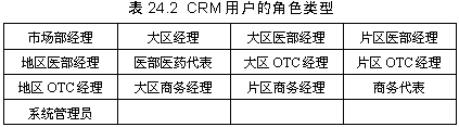 另外,對(duì)CRM系統(tǒng)的用戶也進(jìn)行了明確的定義,按照工作性質(zhì),以及本著能夠快速高效地共享信息,提高銷(xiāo)售能力和工作效率的原則,確定表24.2所示的CRM用戶的角色類(lèi)型。