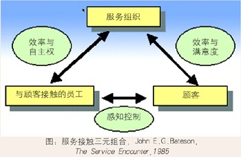 在Bateson的“三元組合”模型中,顧客通過(guò)“與顧客接觸的員工”感受到服務(wù)提供商提供的服務(wù),從而對(duì)服務(wù)組織的服務(wù)效率和滿意度做出自己的評(píng)價(jià)。這種情況下,顧客的“滿意”與“不滿”是通過(guò)“與顧客接觸的員工”獲得的,但服務(wù)感知同時(shí)反映了服務(wù)組織給予“與顧客接觸的員工”的自主權(quán)和“員工的接受程度”。