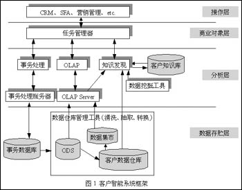 圖1描述了一個(gè)典型的客戶智能系統(tǒng)體系結(jié)構(gòu)。面向特定的應(yīng)用,客戶智能的體系結(jié)構(gòu)會(huì)有所改進(jìn),以使系統(tǒng)與具體的業(yè)務(wù)相符。例如:建立何種數(shù)據(jù)存貯和數(shù)據(jù)模型能很好地支持主題,支持客戶數(shù)據(jù)分析和客戶知識(shí)發(fā)現(xiàn)的需要;選擇何種決策分析工具;將發(fā)現(xiàn)的客戶知識(shí)通過(guò)何種接口傳送給相應(yīng)的用戶等等,都需要實(shí)際情況結(jié)合起來(lái)考慮。